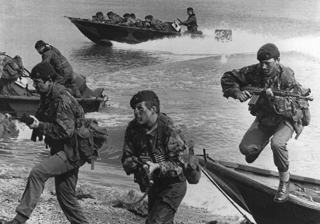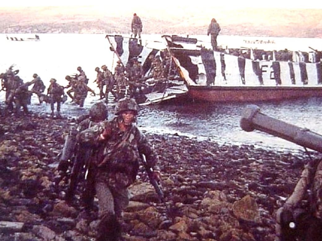 Se inicia el desembarco con helicóptero. El primer helicóptero aterriza bien. Nosotros lo veíamos porque el director de tiro tiene cámara de televisión. Entonces veíamos todo el movimiento de los ingleses –que ya nos estaban esperando, esa es la diferencia que tuvimos nosotros con Malvinas. Malvinas se suponía…que los ingleses sabían que iba a haber una toma pero no sabían qué día. En cambio a nosotros ya nos estaban esperando. Ya sabían. Esa era la diferencia que tuvimos nosotros, por eso tuvimos más bajas.