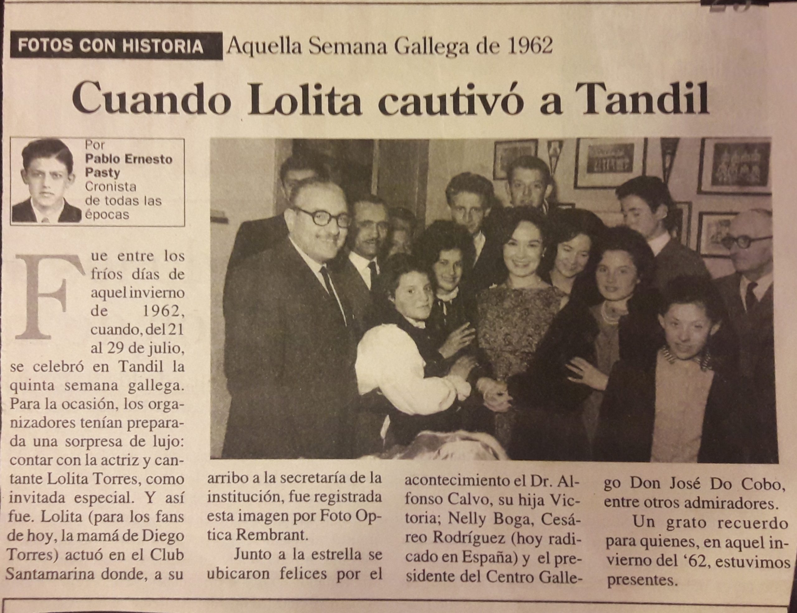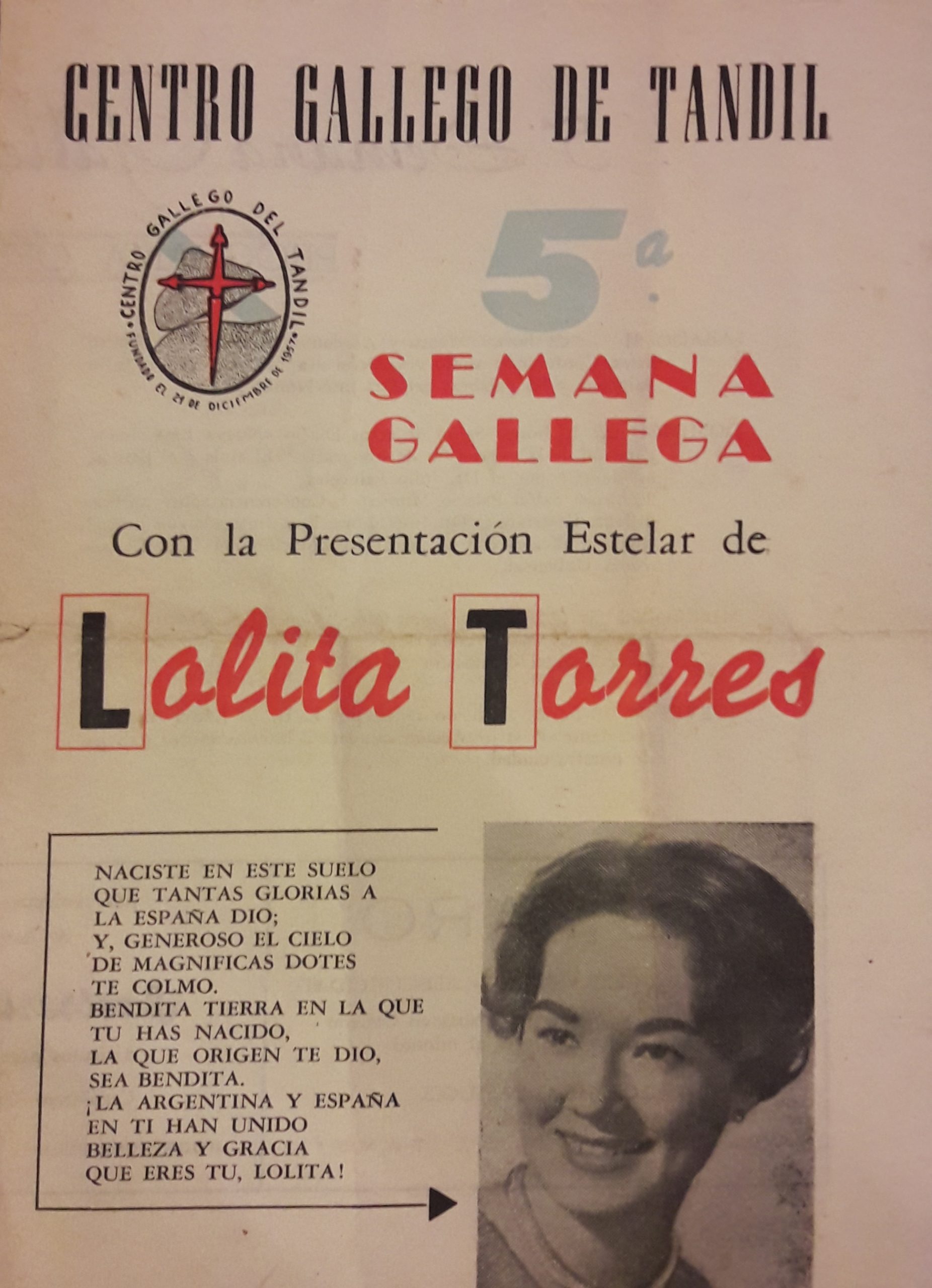 NM: En el año 1962 vino Lolita Torres a cantar al Centro Gallego que para esa época fue un suceso. Hay una foto en el Centro muy particular de esa Semana Gallega: está ella con un tapado y todas las chicas del Centro a su alrededor fascinadas.