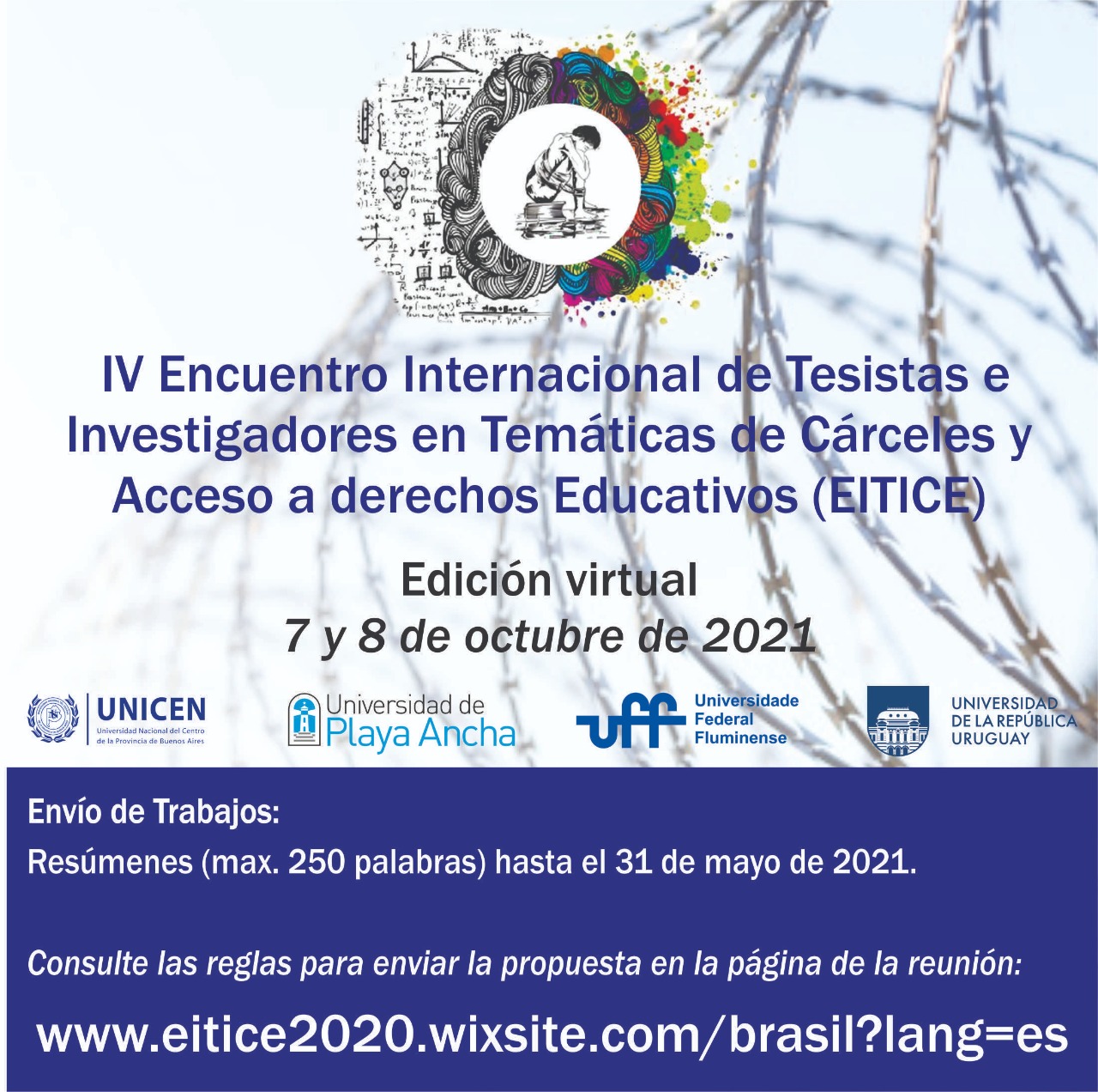 El EITICE es una iniciativa de distintas universidades del Cono Sur que busca promover la investigación sobre temas vinculados al encarcelamiento y al acceso a derechos educativos en espacios de privación de libertad. La convocatoria está dirigida a tesistas de grado y posgrado e investigadores cuyas indagaciones se encuentren en desarrollo o hayan sido terminadas en los últimos 5 años.