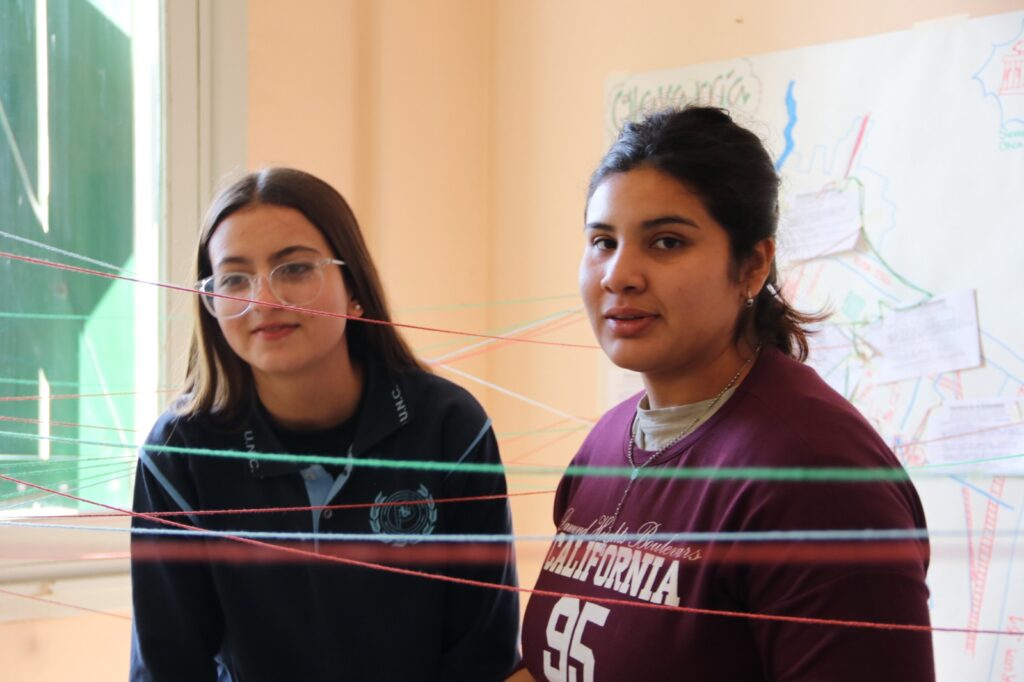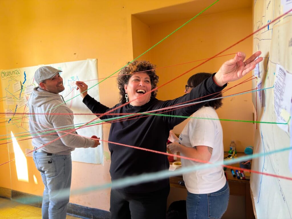 Posteriormente, las y los participantes compartieron el almuerzo y participaron de dinámicas grupales que buscaron fortalecer los lazos y representar simbólicamente la red universitaria. En una de las actividades, hilos de lana unieron a los presentes en un gran mapa colectivo que puso en evidencia la trama viva que sostiene a la extensión en el territorio.